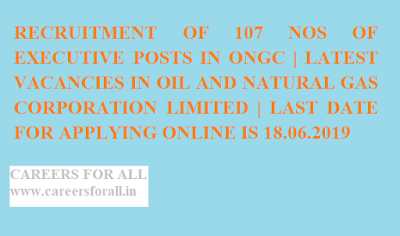 RECRUITMENT OF 107 NOS OF EXECUTIVE POSTS IN ONGC | LATEST VACANCIES IN OIL AND NATURAL GAS CORPORATION LIMITED | LAST DATE FOR APPLYING ONLINE IS 18.06.2019